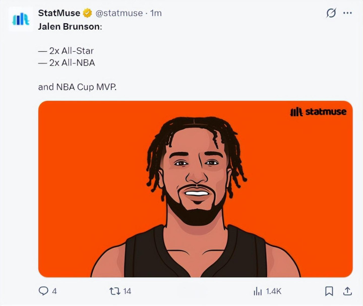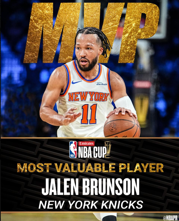 布伦森来到尼克斯照旧聚会入选全明星、最好声势、杯赛冠军、杯赛MVP。他在杯赛淘汰赛阶段场均33.3分6.7助攻,投篮射中率55%,他这个MVP如故实至名归的。